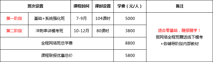 基礎班:循序漸進,理清各科考點;夯實基礎,做到溫故知新; 穩(wěn)扎穩(wěn)打,構建思維模式;透析考點,形成學習體系。系統(tǒng)班:全面復習,強化技巧;系統(tǒng)歸納,總結考點;結合真題,重點突破;運用技巧,快速解題。??即v班:突破重點題型,查漏補缺;體驗全真考場,調整心態(tài);分配答題時間,有的放矢;模擬強化訓練,總結規(guī)律;把握命題規(guī)律,預測考向考點歸納總結,查漏補缺;預測命題態(tài)勢,輕松上陣。報全程面授班:基礎班+系統(tǒng)強化班+沖刺串講??及?13800元/生。7月13日前報班享特大優(yōu)惠價8800元/人(贈送價值5800元全程視頻課+各輔導階段內部資料)。1、報全程網(wǎng)絡班:基礎班+系統(tǒng)強化班+精講模串班=8800元。7月13日前報班享受特大優(yōu)惠價5800元/人。2、報網(wǎng)絡班送:贈送模考+各輔導階段內部資料。3、網(wǎng)絡視頻課針對沒有時間參加面授班學員,手機、電腦下載APP可自由安排時間學習,費用低,效率高。